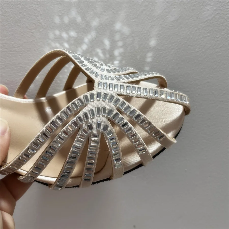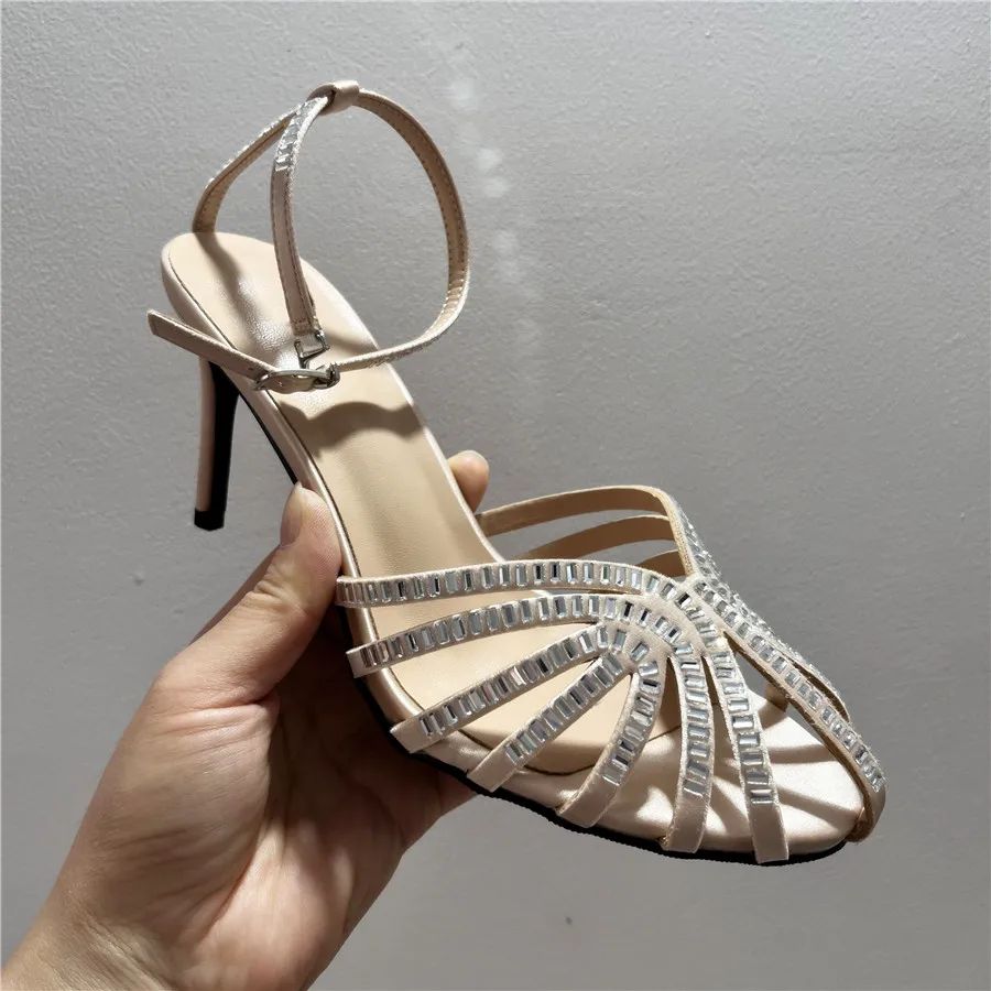 2025 Designer Rhinestone Women Gladiator Sandals Ankle Strap High Heel Shoes Hollow Out Summer Dress Pumps Closed Toe Stiletto