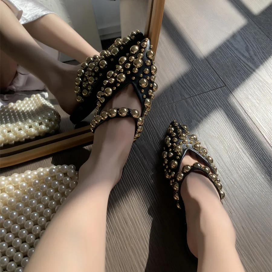 2025 New Pointed Toe Women Slippers Rivets Studded Summer Gladiator Sandals Flat Beach Shoes Woman Outside Slides Fashion Mules