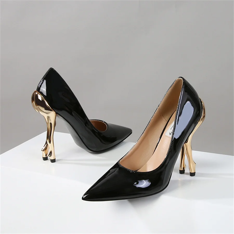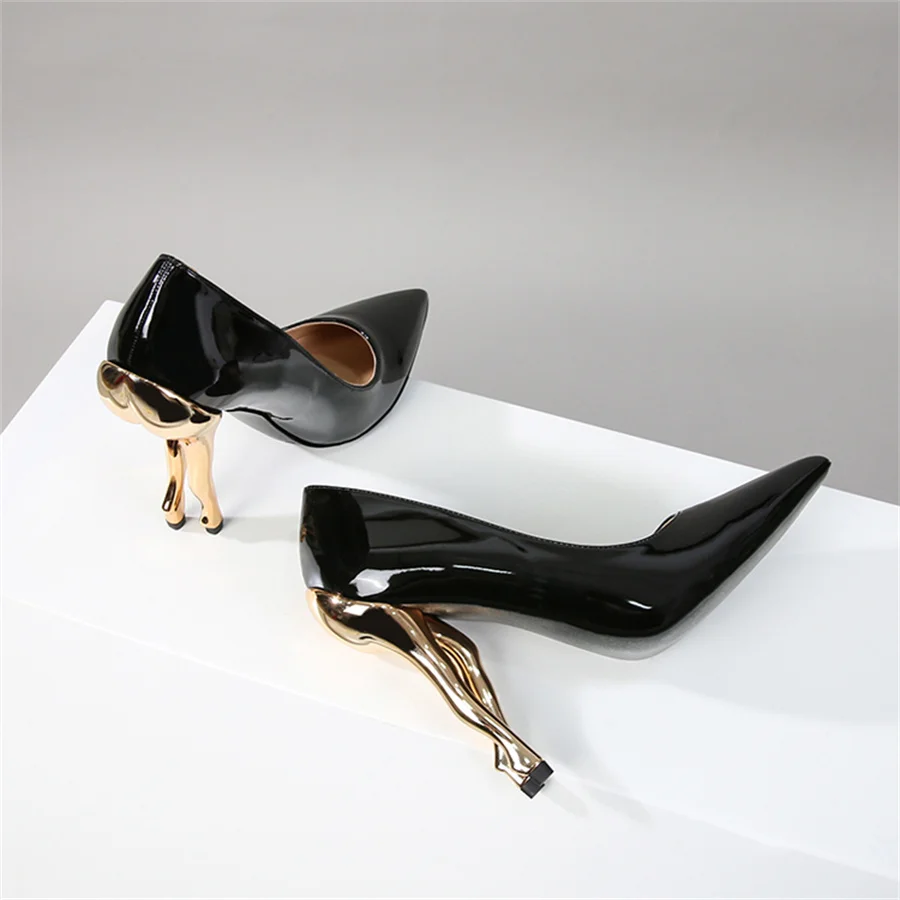 Deigner Gold Hip High Heels Runway Women Pumps Pointed Toe Strange Heel Dress Shoes Black Patent Leather Ladies Stiletto