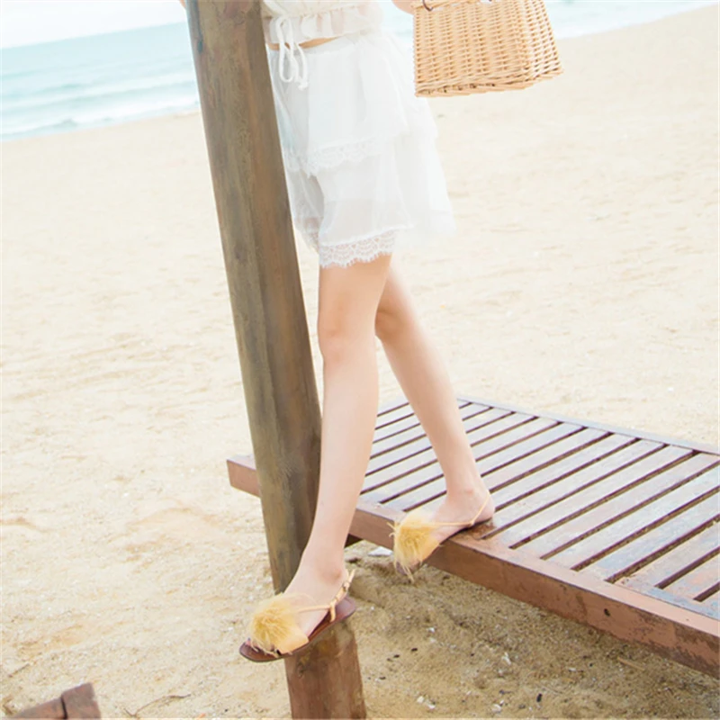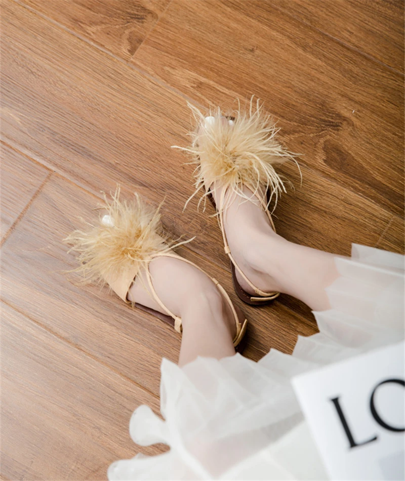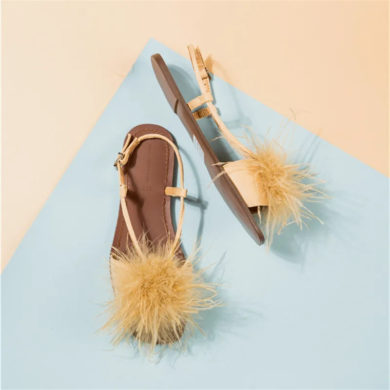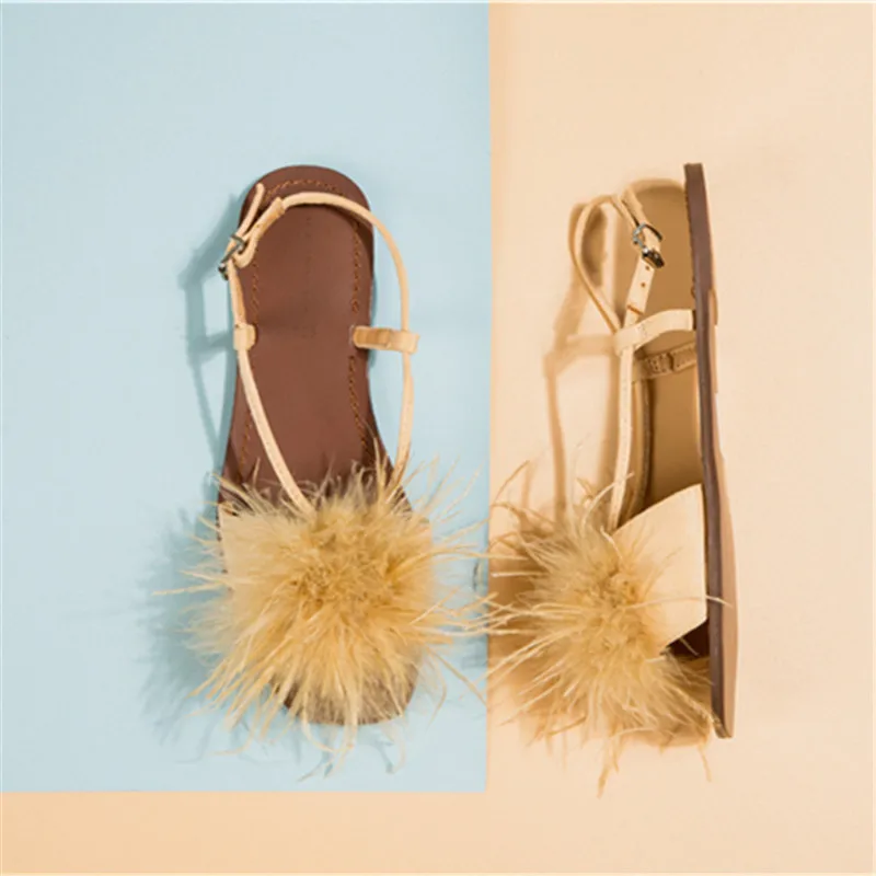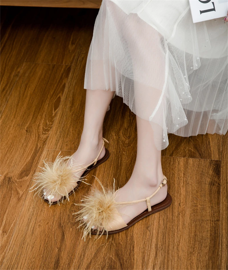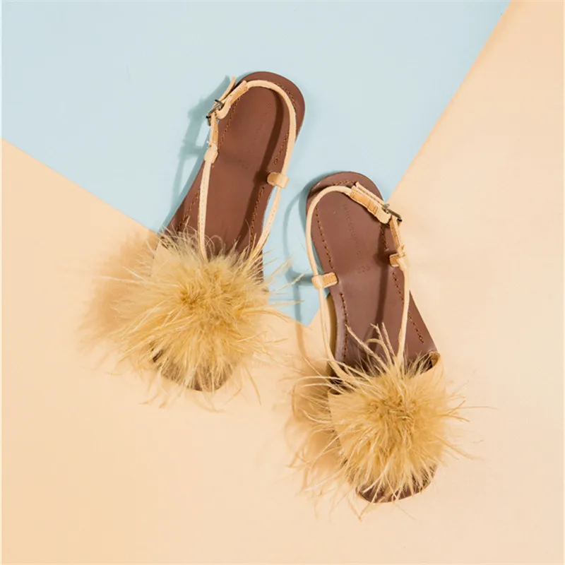 Feather Women’s Sandals Summer 2025 Fur Flat Shoes Ladies Bohemia Beach Slippers Square Toe Casual Gladiator Sandalias Mujer