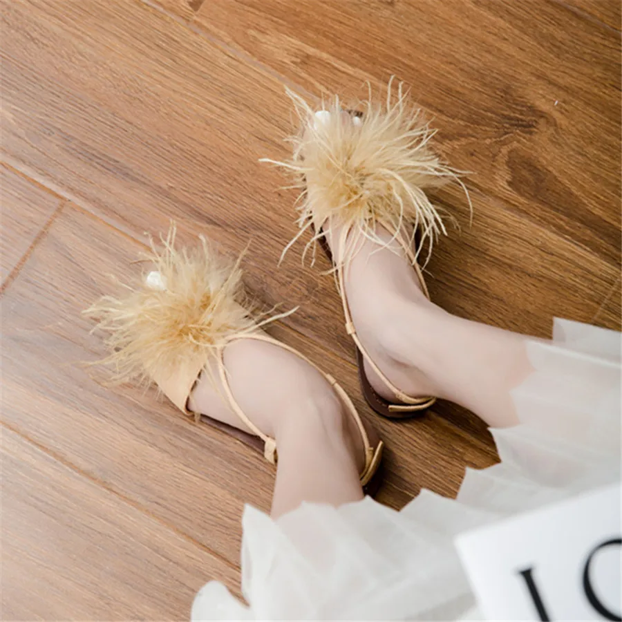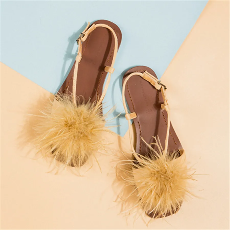 Feather Women’s Sandals Summer 2025 Fur Flat Shoes Ladies Bohemia Beach Slippers Square Toe Casual Gladiator Sandalias Mujer